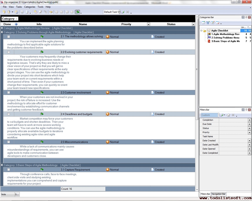 The following Agile Checklist gives you a quick review of the agile methodology, its advantages and limitations and allows you to understand the basic steps of this PM methodology.
