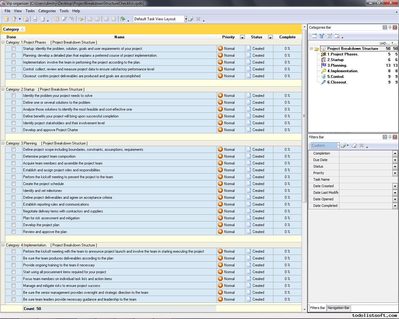 Creating an activity list for a typical project allows you to identify and define all the activities to be undertaken to initiate, plan, implement and close the project. The following Project Activities Checklist explains how to develop such a list. It describes the major activities for every phase of a typical project.