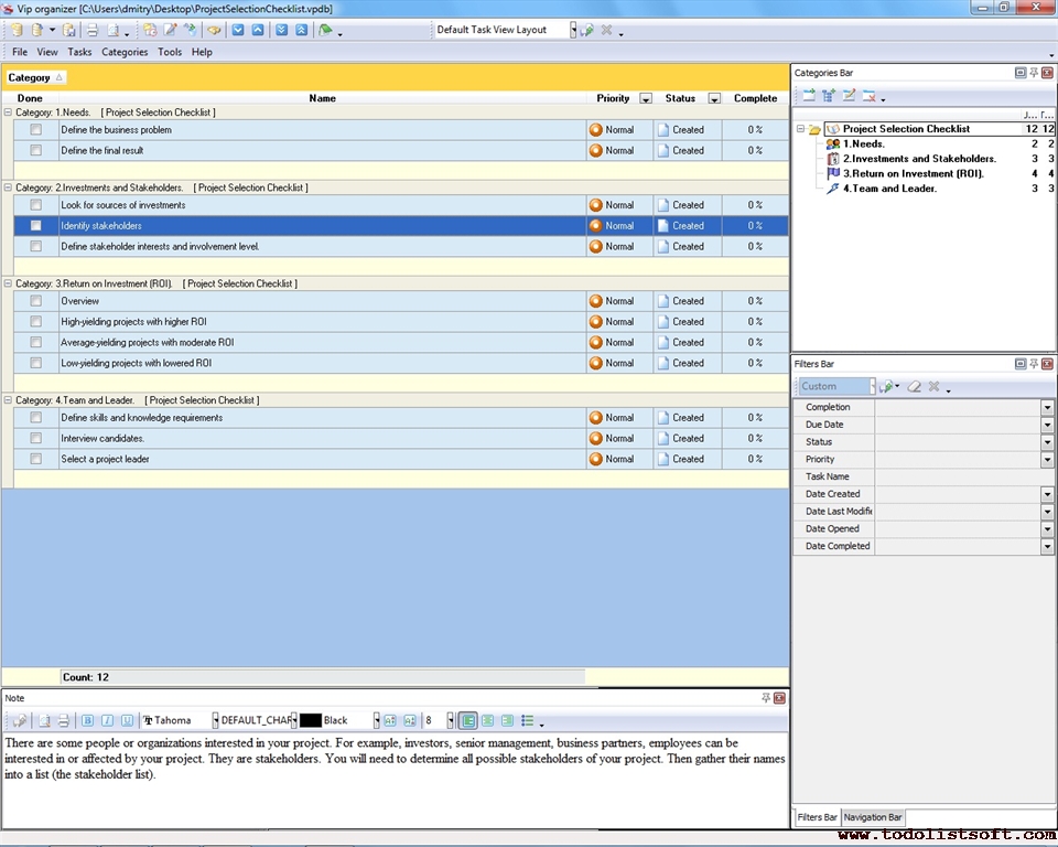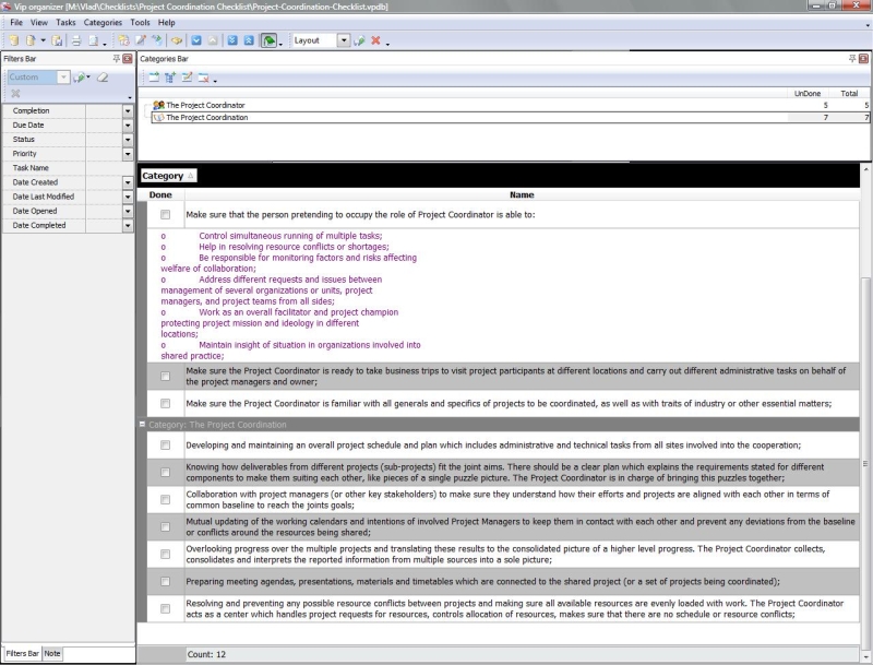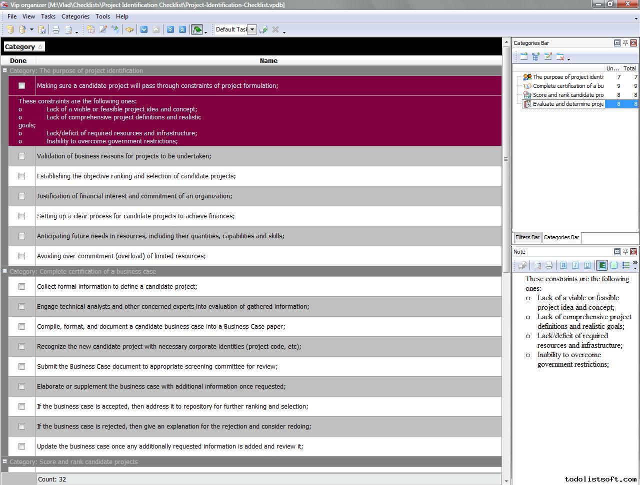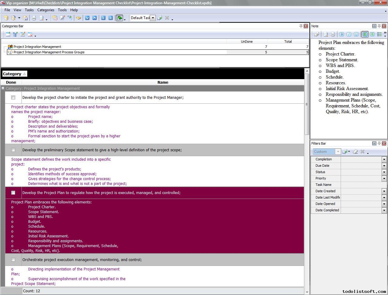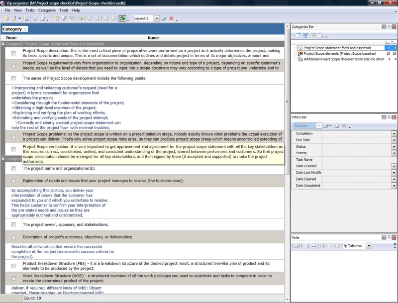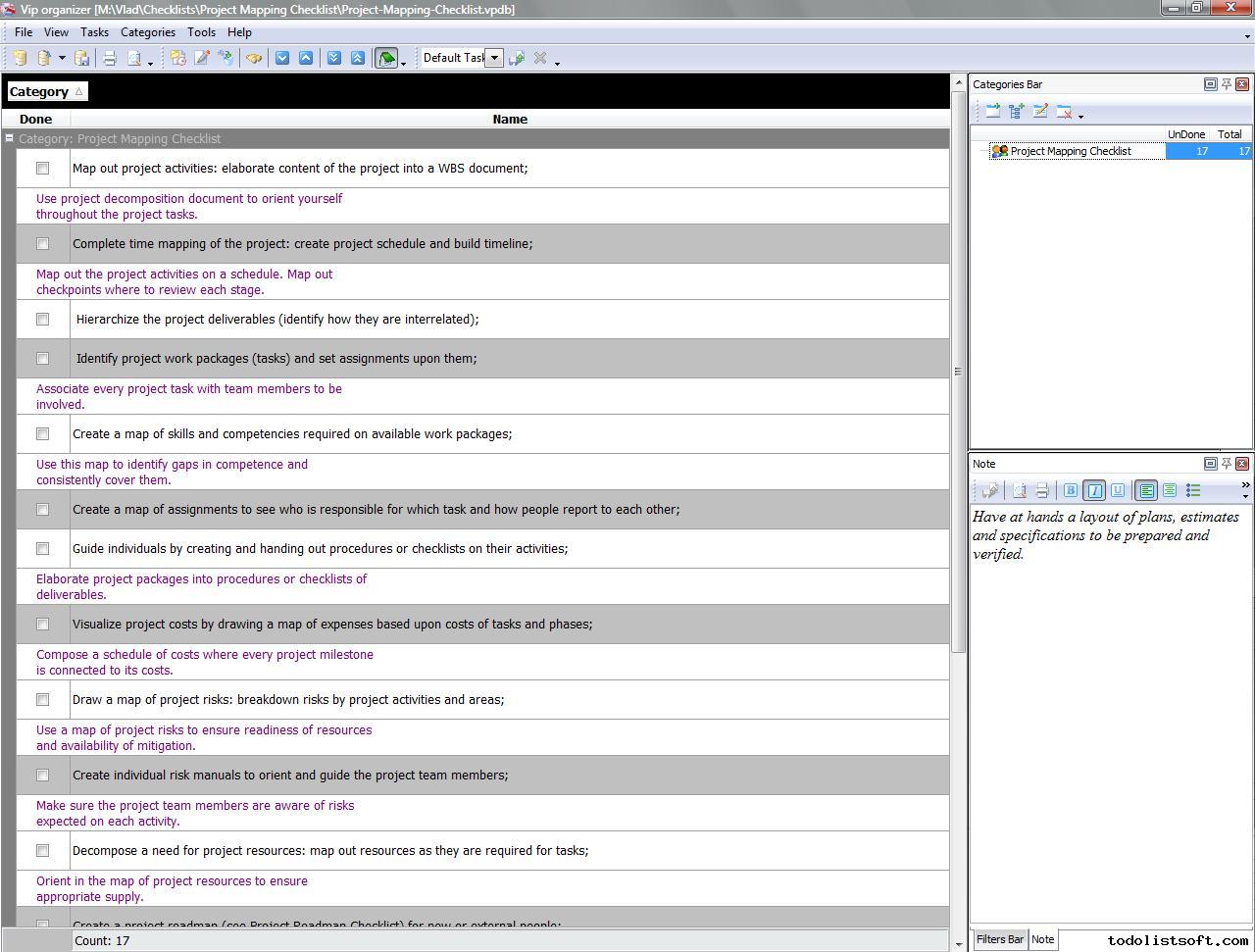 Use this Project Tailoring Checklist to tailor and incorporate your project to the business process environment of your organization. The checklist is a step-by-step guide that includes a range of tasks. You can use VIP Organizer software to do the checklist.
