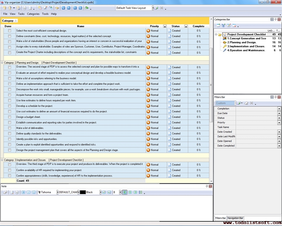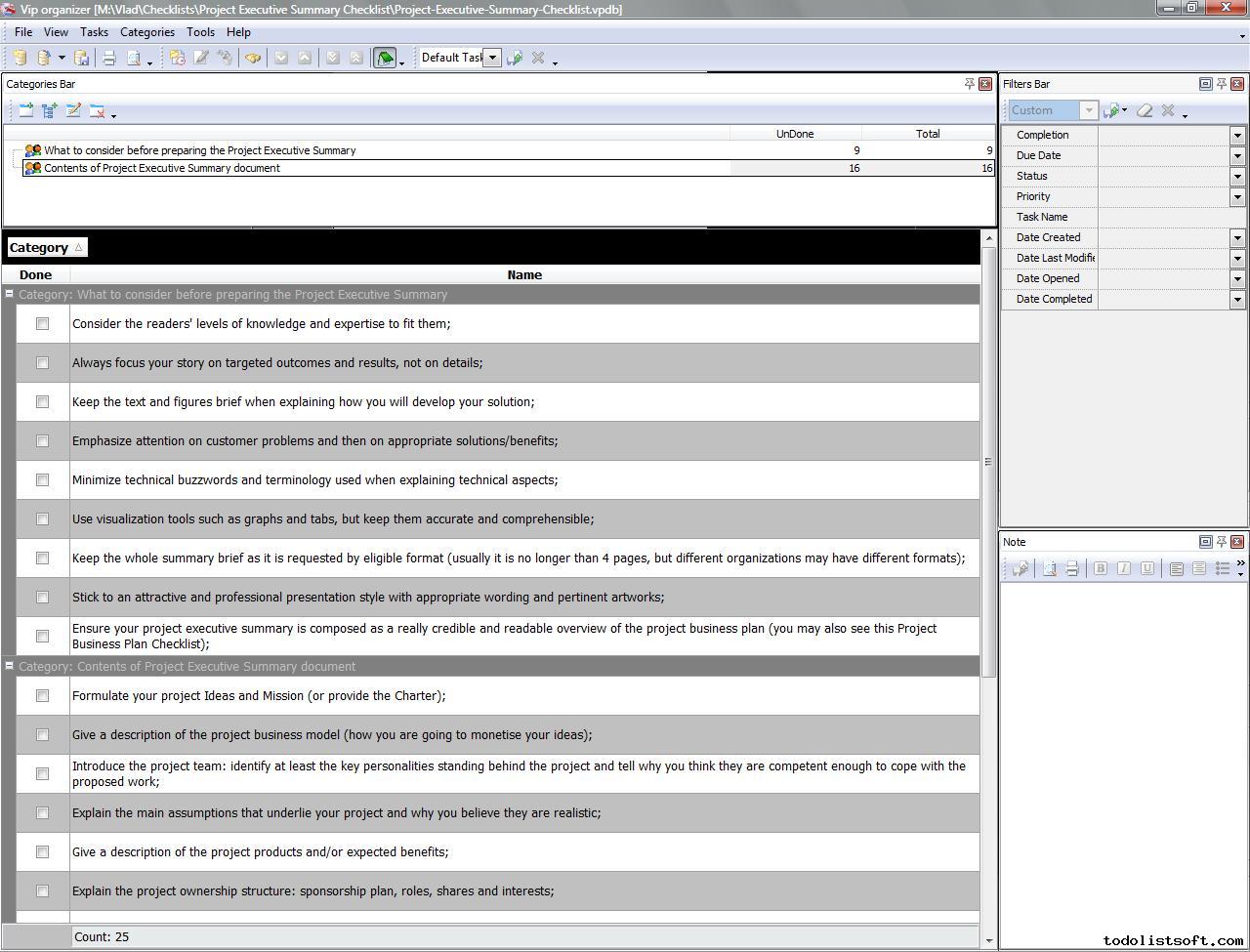 Project Business Plan Checklist is created for business managers and project initiators who would like to manage transferring of their conceptualized projects into real action. In this checklist you can find sections that you may include into your business plan that will justify initiation of your project.