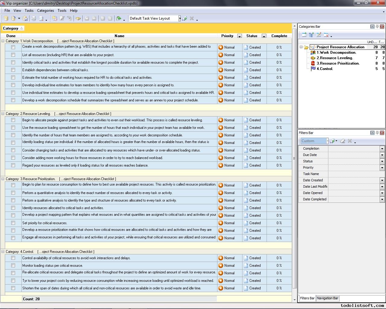 Project scheduling is a process that states how to manage time and resources to accomplish work. Use a scheduling software tool (VIP Task Manager is recommended) and t his developing project schedule checklist to plan and track the schedule of your project.