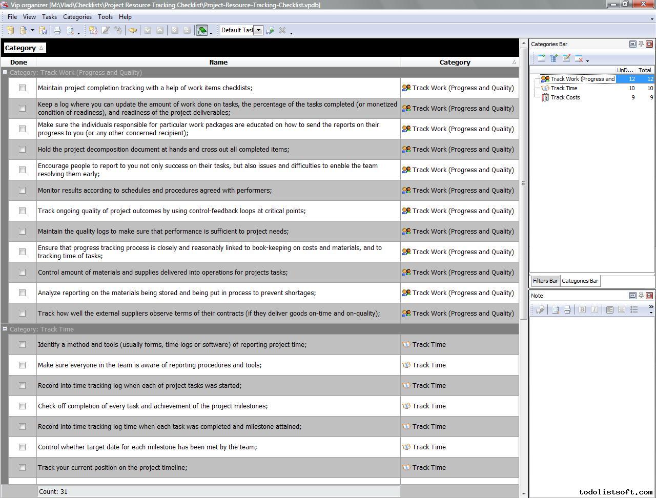 The project tracking checklist contains guidelines and tips to help you keep your project on track and make sure the project activities meet your expectations and produce deliverables . Use this checklist at your project tracking workspace each time when you need to control and monitor tasks, jobs and events of the project.