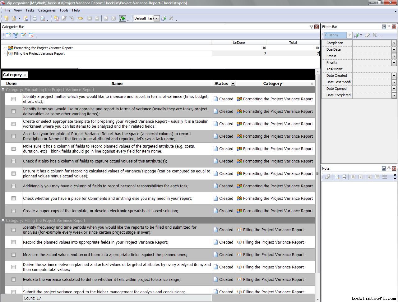 Project Variance Report Checklist is created for project managers who wish to derive variance between actual and planned values of the critical project parameters. With a help of this checklist you can create worksheets for creating project variance forms and learn algorithm of using them.