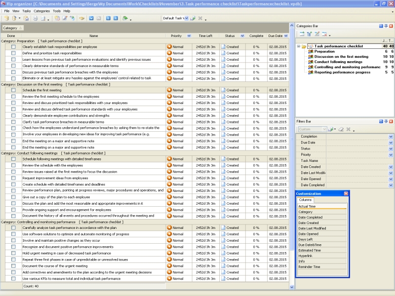 Task performance can be used as collaborative indicators of how a project or a business process is being run. It is generally assumed that better task performance means higher project development or process progress, because task performance is a causal link between phases and stages of a project or process. The task performance checklist helps initiate a project or start a process, and characterize their progress.