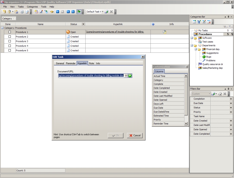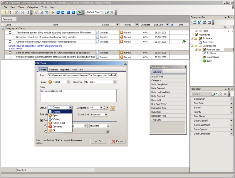 VIP Organizer software is a good solution for IT analyst who needs to organize individual professional activity. It is personal easy-to-use tasks management software which allows the IT analyst to plan and categorize tasks, set timelines and priorities, manage notes and documents, set task reminders, create printable checklists and so on.