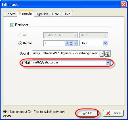 6. Enter e-mail address you want a reminder to be send to and click ‘Ok’